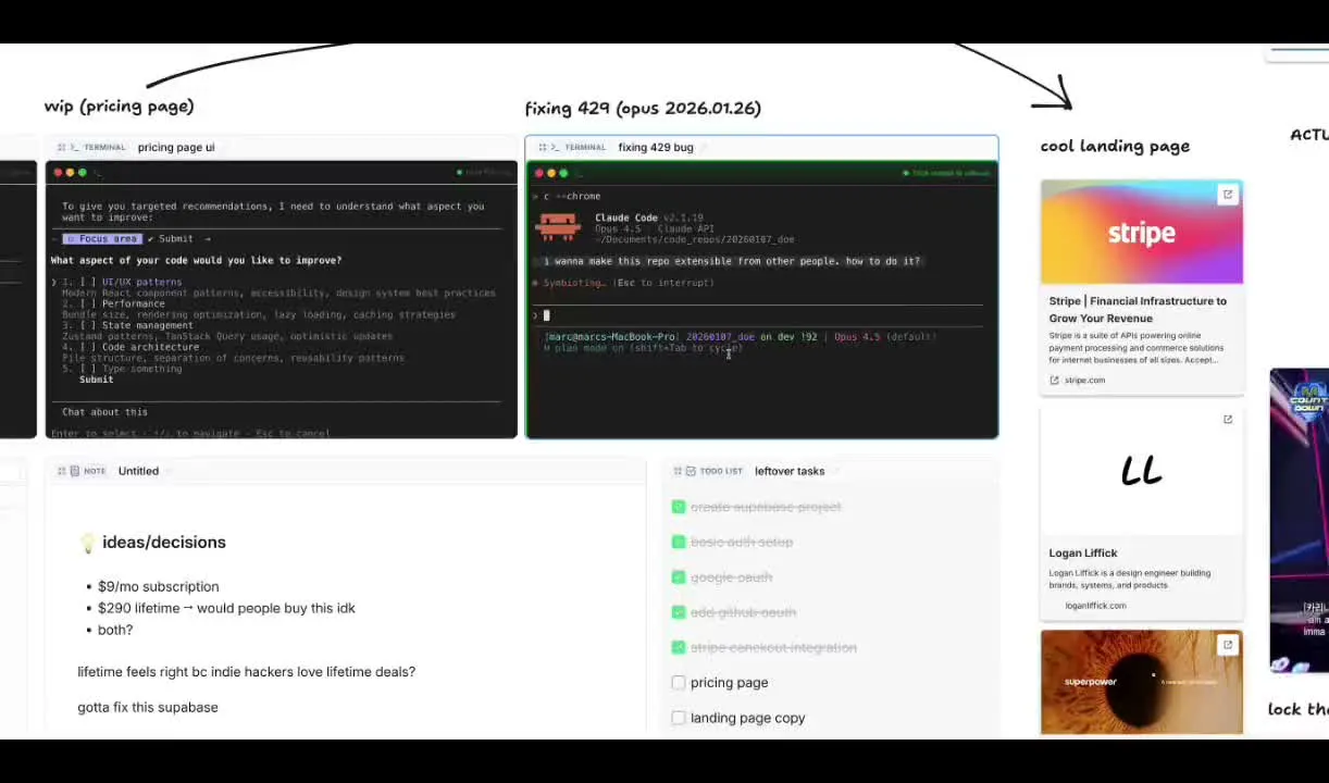 Right now we're running 12 Claude Code terminals in this app, task tracking on the right side, weekly habit checklist pinned up, 4 browser tabs, and YouTube lofi girl playing. All in one desk.
